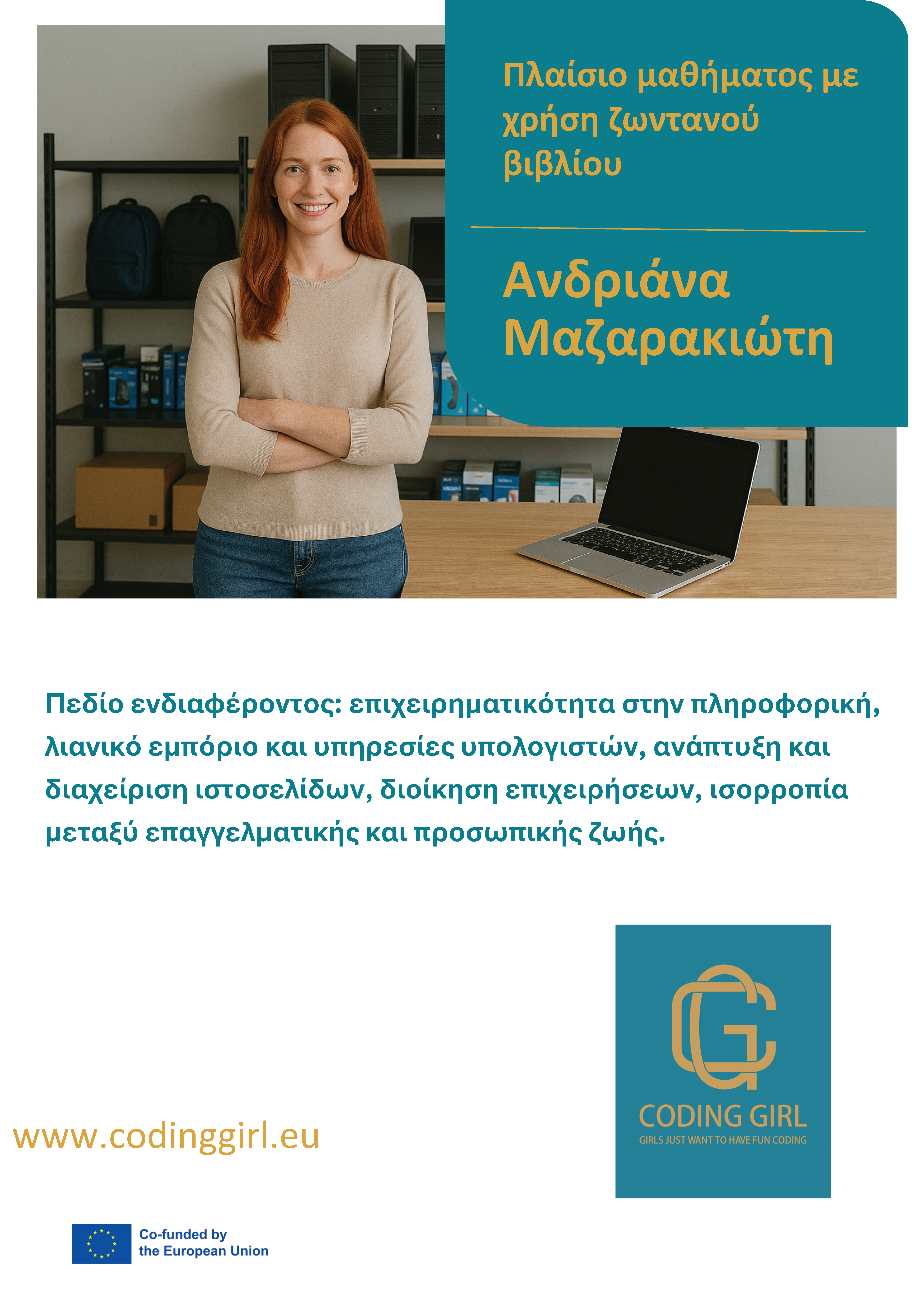 Adriana Mazarakioti is an entrepreneur and co-owner of a computer store based in Patras, Greece. She studied Public Administration and Economics at Panteion University in Athens, graduating in 2018, and later earned an MBA from the European University Cyprus through distance learning. Her educational background in management and economics helped her build strong organizational and business skills, which she later combined with her passion for technology to create a successful career in the IT sector.