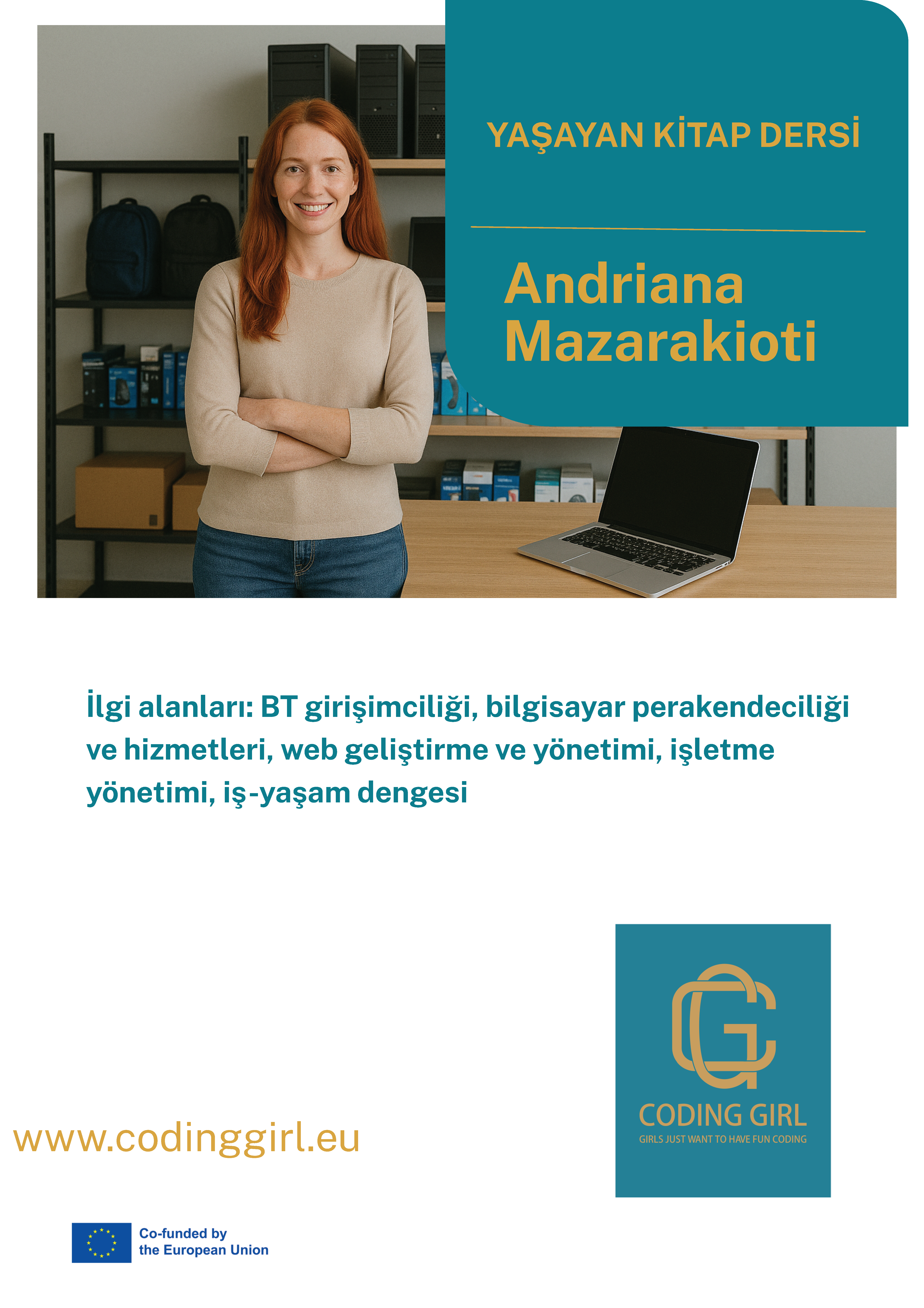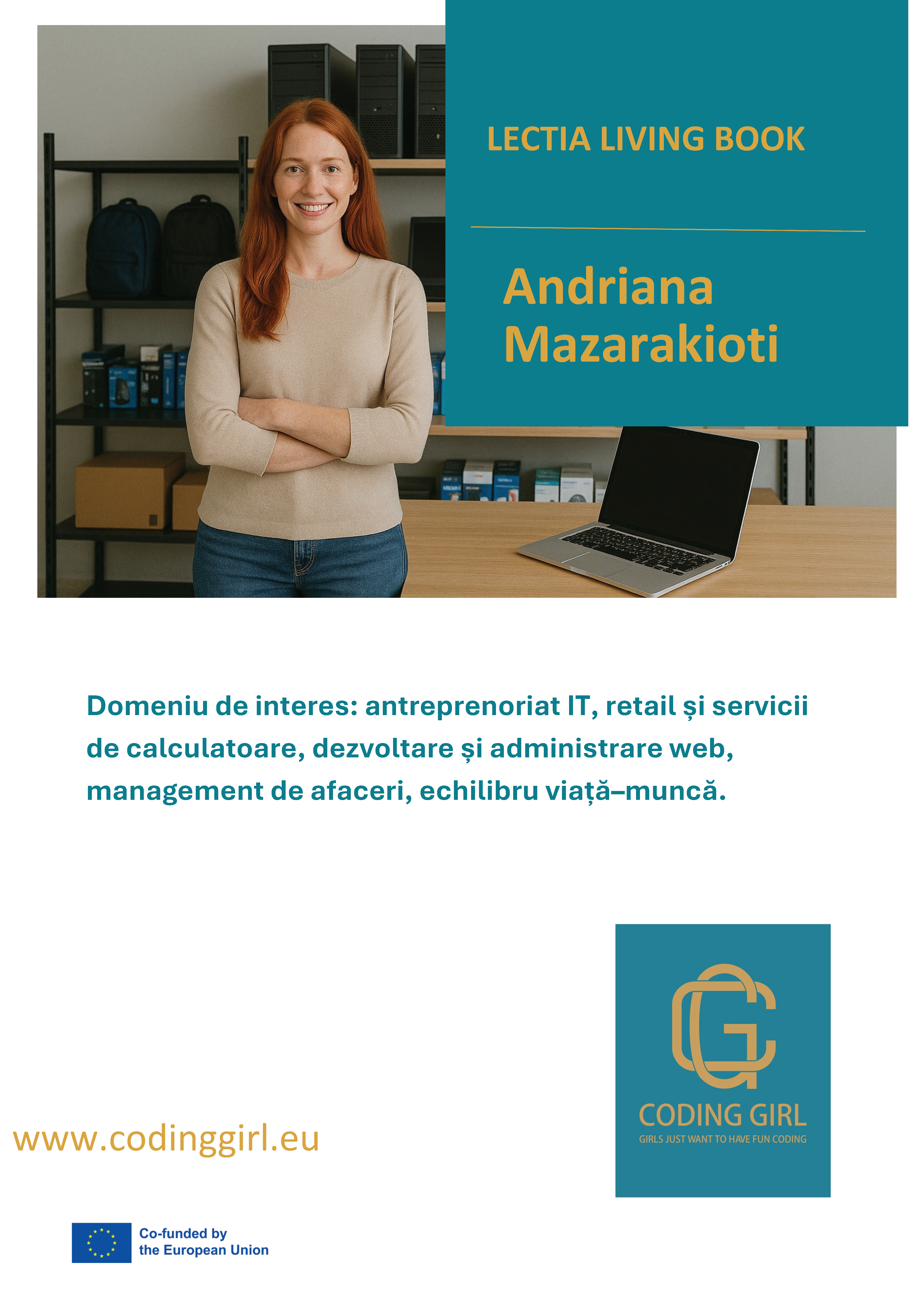 Adriana Mazarakioti is an entrepreneur and co-owner of a computer store based in Patras, Greece. She studied Public Administration and Economics at Panteion University in Athens, graduating in 2018, and later earned an MBA from the European University Cyprus through distance learning. Her background in management and economics helped her develop strong organizational and business skills, which she later combined with her passion for technology to build a successful career in the IT sector.