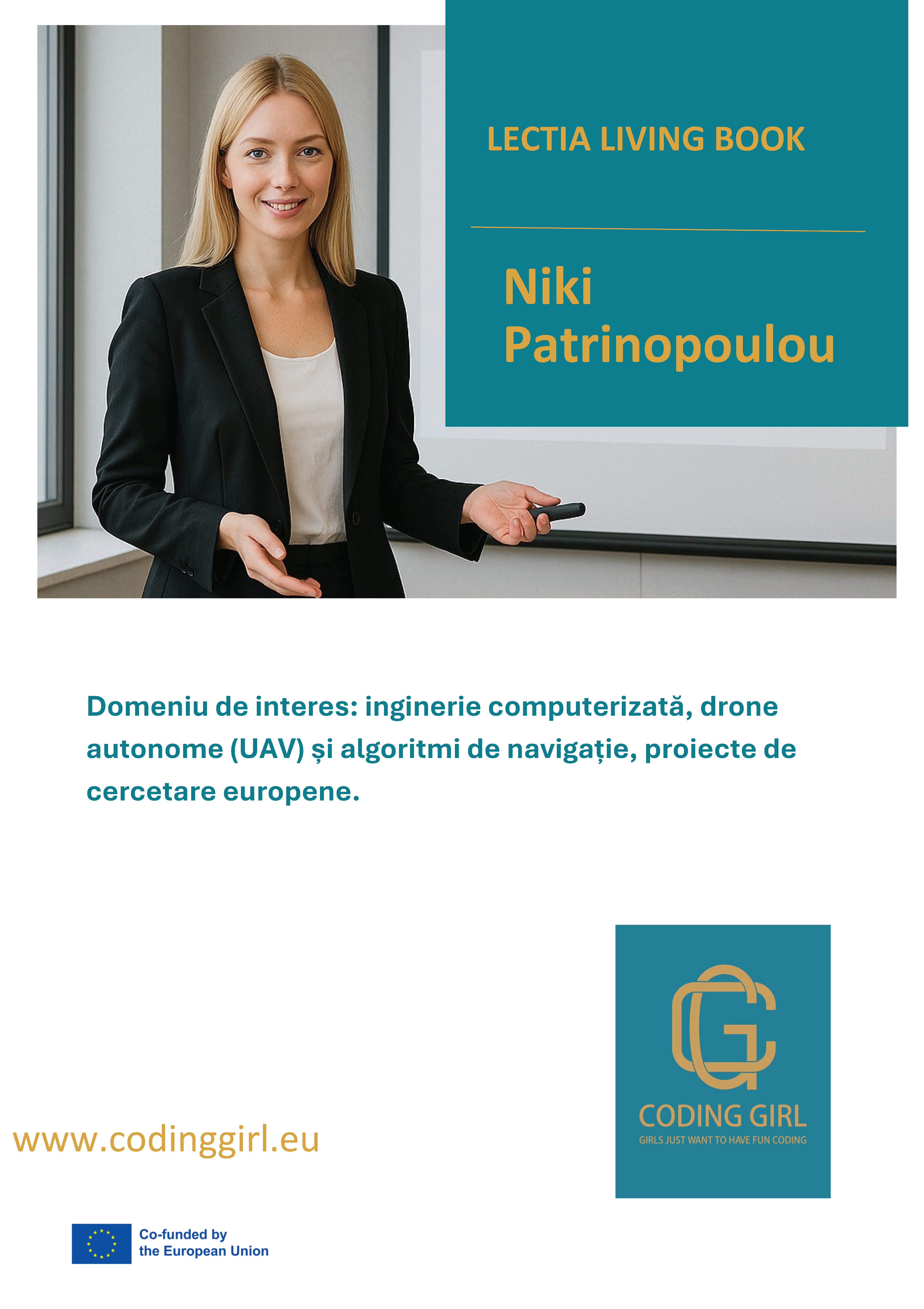 Niki Patrinopoulou este inginer în calculatoare și cercetătoare postdoctorală, specializată în sisteme autonome de drone. A studiat Inginerie Electrică și Calculatoare la Universitatea din Patras, unde și-a dezvoltat un interes puternic pentru robotică, sisteme de control și algoritmi inteligenți. Parcursul său academic a condus-o către realizarea unui doctorat axat pe navigație pentru UAV-uri, planificare de traseu, evitare a coliziunilor și cooperare între drone multiple, finalizat în 2024. În timpul cercetării, a explorat modul în care dronele pot lua decizii sigure, eficiente și autonome în medii complexe, utilizând tehnici avansate de programare și simulare.