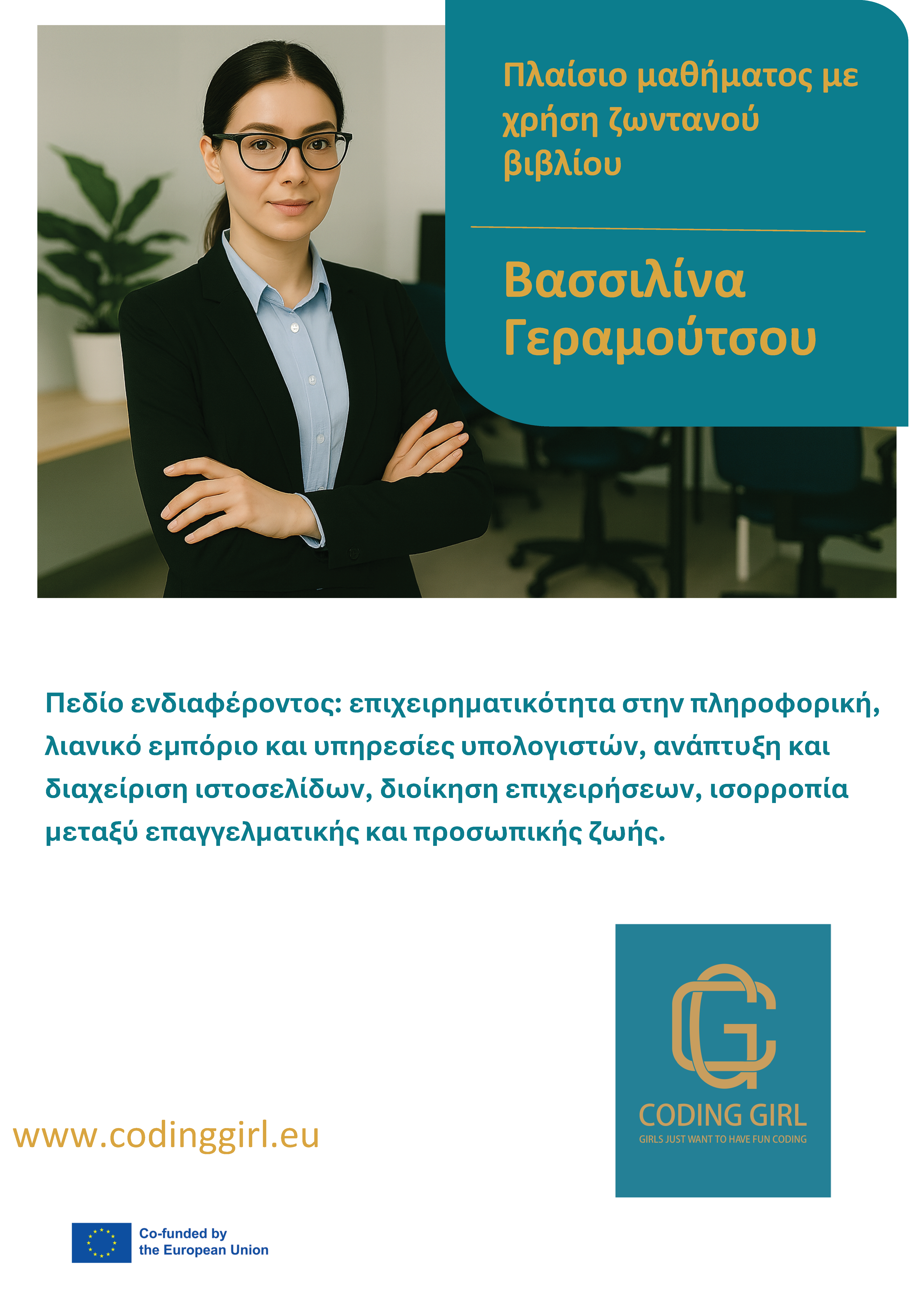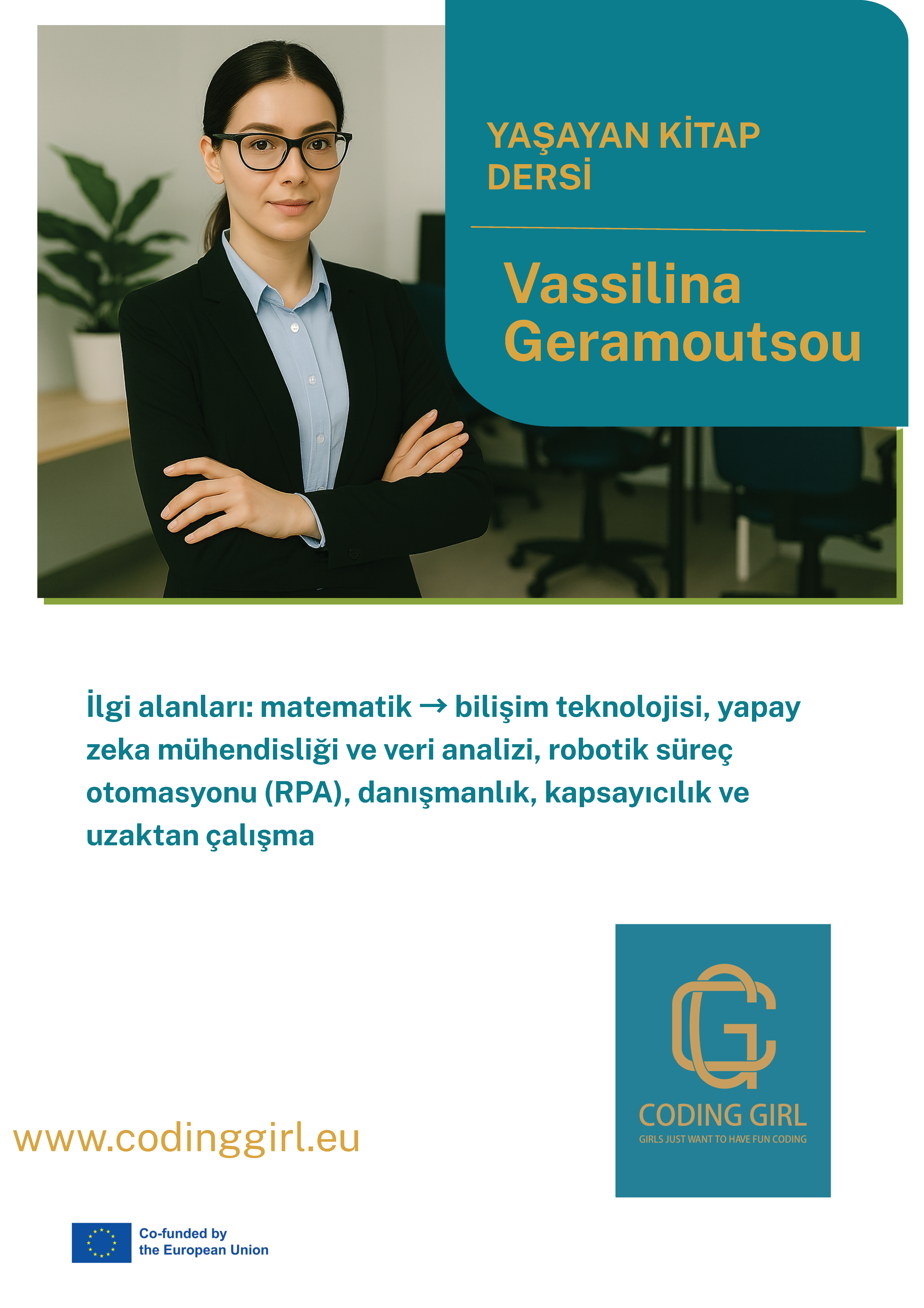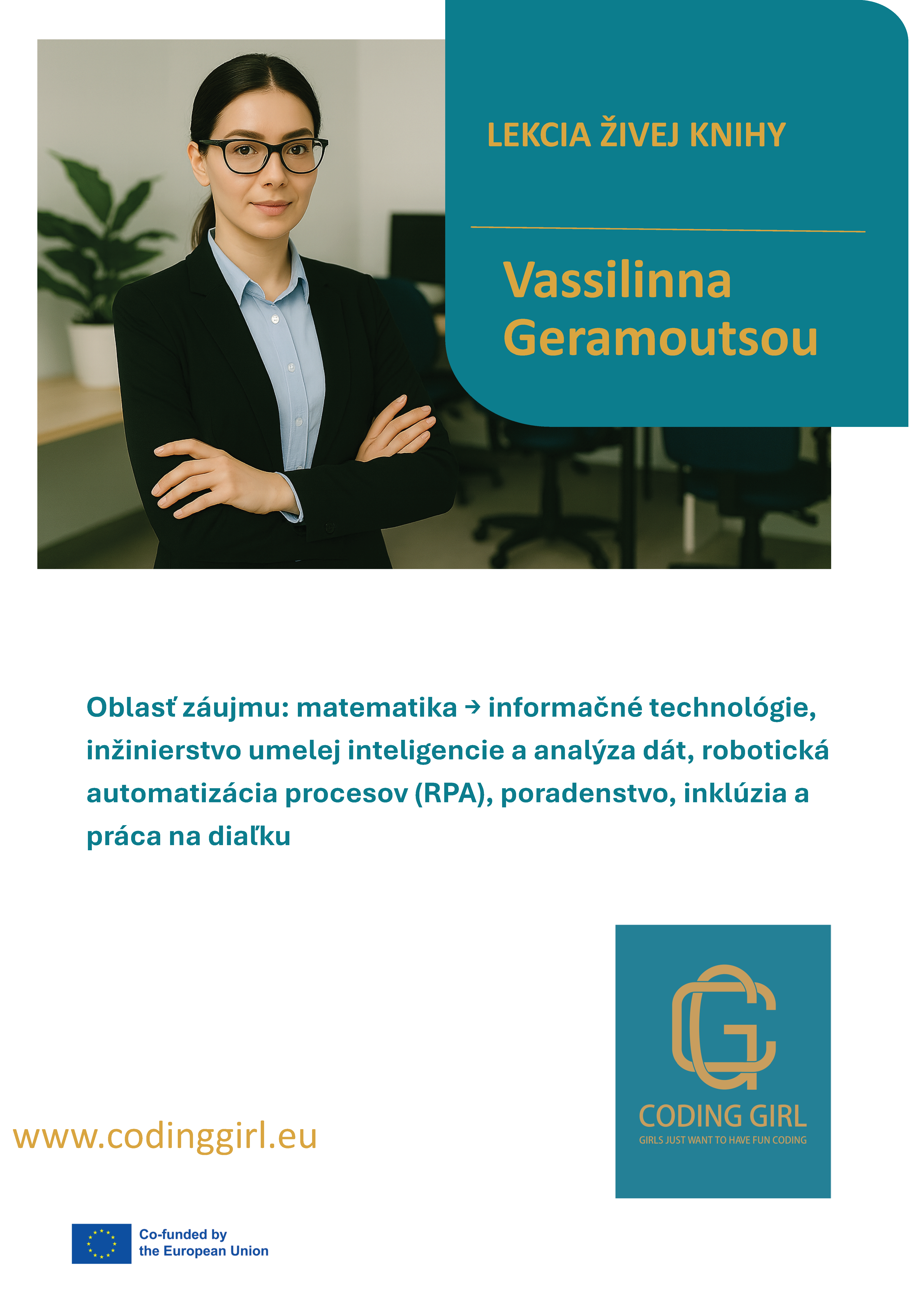 Vasilina Geramoutsou je inžinierka umelej inteligencie a dátová analytička, ktorá spája silný matematický základ s vášňou pre technológie a inovácie. Študovala matematiku na Univerzite v Patrase a následne absolvovala magisterské štúdium v odbore Analýza dát a rozhodovanie na Katedre elektrotechniky a informatiky tej istej univerzity. Počas štúdia získala cenné skúsenosti v programovaní, robotike, automatizácii a umelej inteligencii a vypracovala diplomovú prácu zameranú na aplikácie AI.