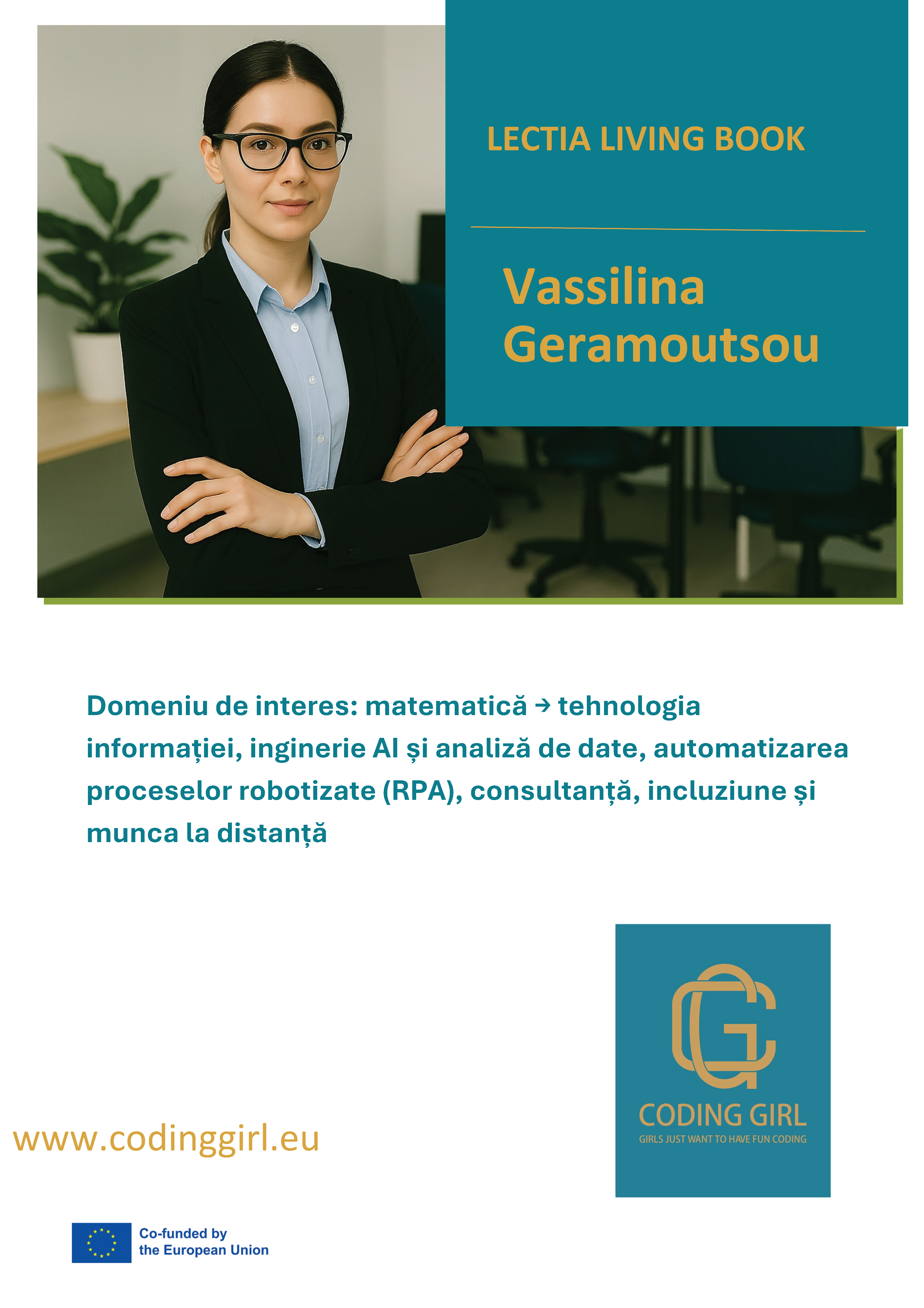 Vasilina Geramoutsou este inginer în inteligență artificială și analistă de date, combinând o bază solidă în matematică cu pasiunea pentru tehnologie și inovație. A studiat Matematică la Universitatea din Patras și a urmat un program de master în Analiza Datelor și Luarea Deciziilor la Departamentul de Inginerie Electrică și Calculatoare al aceleiași universități. În timpul studiilor, a acumulat experiență valoroasă în programare, robotică, automatizare și inteligență artificială, realizând o lucrare de disertație axată pe aplicații AI.
